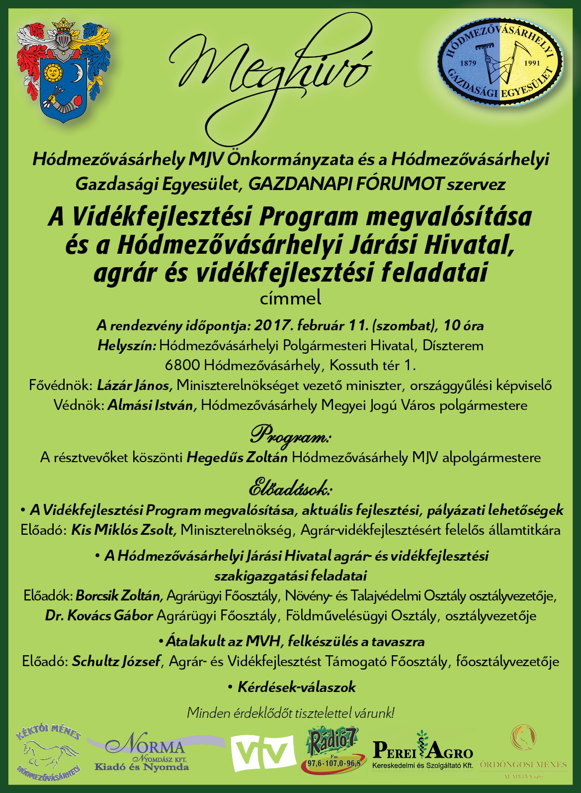 Február 11-én, sikeresen lezajlottak az idei Gazdanapi rendezvényeink. Délelőtt a Városháza, dísztermében tartott fórumon, a megjelent érdeklődőket Hegedűs Zoltán alpolgármester köszöntötte, aki reményét fejezte ki, hogy a már elindult elkerülő út fejlesztés hozzájárul a gazdálkodók közlekedési gondjainak megoldásában, illetve elmondta azt is, hogy a tavaly elkezdett külterületi út gréderezést, az idén folytatni kívánják. Kis Miklós Zsolt, a Miniszterelnökség, Agrár és vidékfejlesztésért felelős államtitkára előadásából részletes tájékoztatást kaptak a Vidékfejlesztési Program (VP)megvalósítását, a jelenlegi és a közeljövőben megjelenő pályázatokat illetően. Államtitkár úr előadásából megtudtuk, hogy a VP további 14 felhívását, március végéig megkívánják jelentetni.