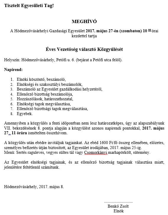 | 2017.11.30. | Falugazdász előadás 11.30 | A Nemzeti Agrárgazdasági Kamara megbízásából Tisztelettel meghívom Önt a 2017. november 30-án tartandó csoportos tájékoztatásra A csoportos tájékoztatás helyszíne: Hódmezővásárhelyi Gazdasági Egyesület 6800 Hódmezővásárhely, Petőfi u. 6. A csoportos tájékoztatás időpontja: 2017. november 30. 16:00 óra Az előadás napirendi pontjai: 1. Köszöntő 2. Az Egységes Kérelem aktualitásai és várható változásai 2018-ban (előadó: Koncz Tamás) 3. Növényvédelmi aktualitások (előadó: Mucsi Krisztina) 4. Jogszerű földhasználat igazolása a területalapú támogatásoknál (előadó: Hidegné Kiss Ildikó) 5. Erdőgazdálkodási pályázatok bemutatása (előadó: Komoly Tamás) 6. Kérdések Megtisztelő jelenlétére számítunk!